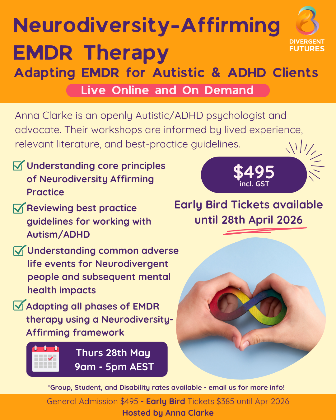 Online workshop is $495 with Early Bird rate ($385) available up to 4 weeks prior to the event. If you are a student/person with a disability, please contact us to discuss possibility of reduced fee on info@divergentfutures.com